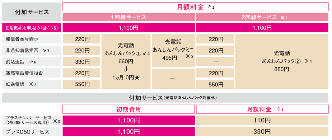 ※4 すべての付加サービスをご契約されることで(プラスナンバーサービスとプラス050サービスを除く)「光電話あんしんパック」の料金が適用されます。個別でのご契約では適用外となりますのでご注意ください。